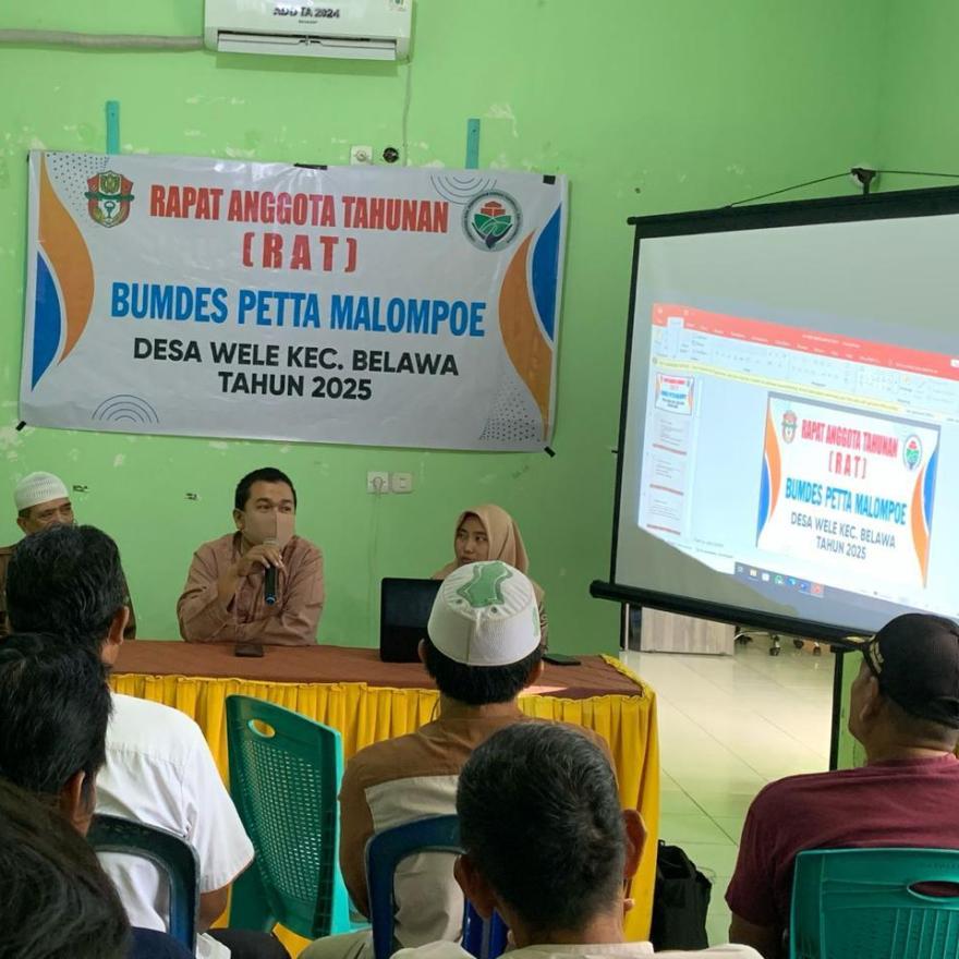 Desa Wele, 30 Januari 2025 — Badan Usaha Milik Desa (BUMDes) Petta Malompoe menggelar Rapat Anggota Tahunan (RAT) Tahun Buku 2024 pada Kamis (30/01) di Aula Kantor Desa Wele, Kecamatan Belawa, Kabupaten Wajo. Kegiatan ini dihadiri oleh jajaran pengurus BUMDes, Pemerintah Desa Wele, serta masyarakat desa setempat.