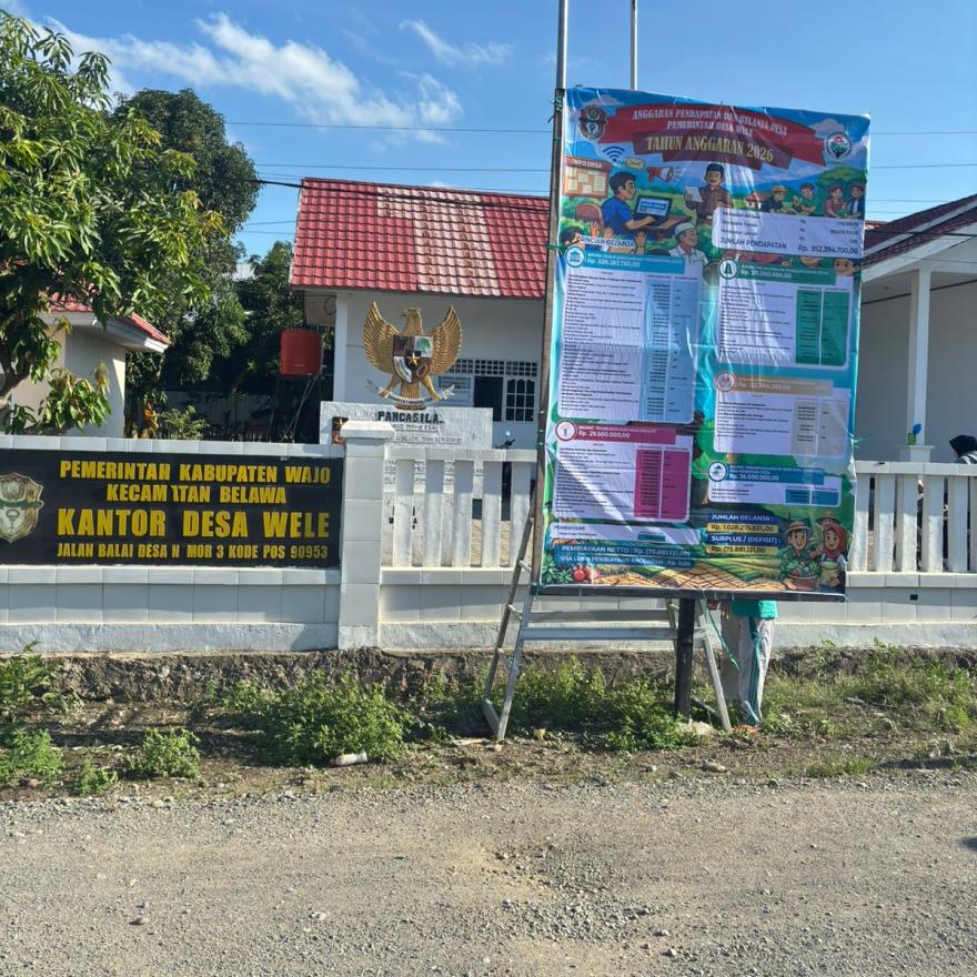 WELE, BELAWA – Memasuki tahun anggaran 2026, Pemerintah Desa Wele kembali menunjukkan komitmennya terhadap tata kelola keuangan yang bersih dan akuntabel. Pada akhir Maret ini, sejumlah baliho infografis berukuran besar yang memuat rincian Anggaran Pendapatan dan Belanja Desa (APBDes) Tahun 2026 mulai dipasang di titik-titik strategis, termasuk di depan Kantor Desa Wele dan area perempatan jalan utama desa.